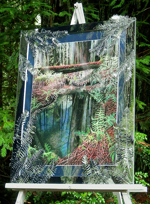 mat in gold wood frame 32"x29" "Mirror metal Sculpture frame with Sequoia Reflections" cost $ 325. painting printed on